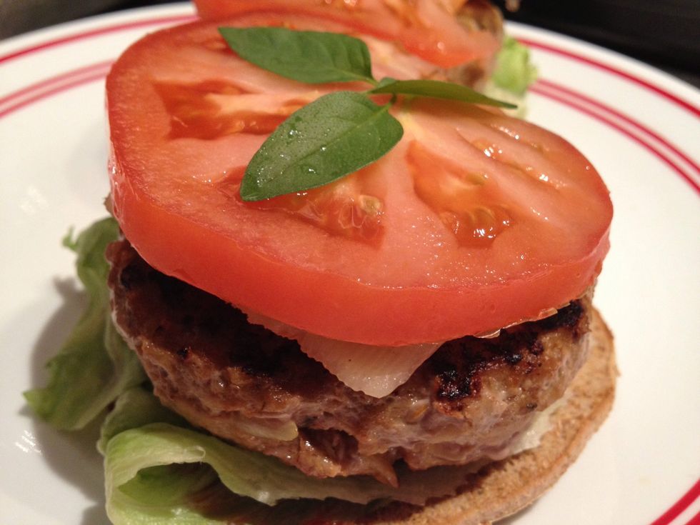Then burger, and a thick slice of tomato + fresh basil
