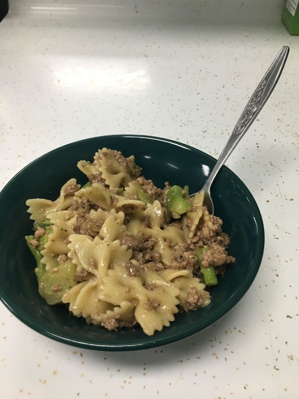Cook and drain the ground beef. Put steamer bag of broccoli in the microwave.
