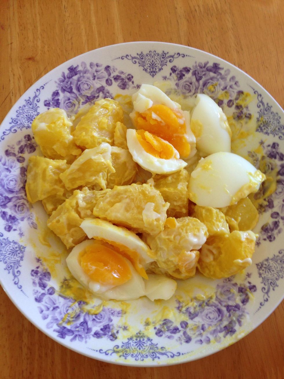 Boil the eggsAnd PotatoesAdd some saltMix with mayo and mustardAnd add the eggs. Tadaaaa.... 2/5 for the taste hahaha
