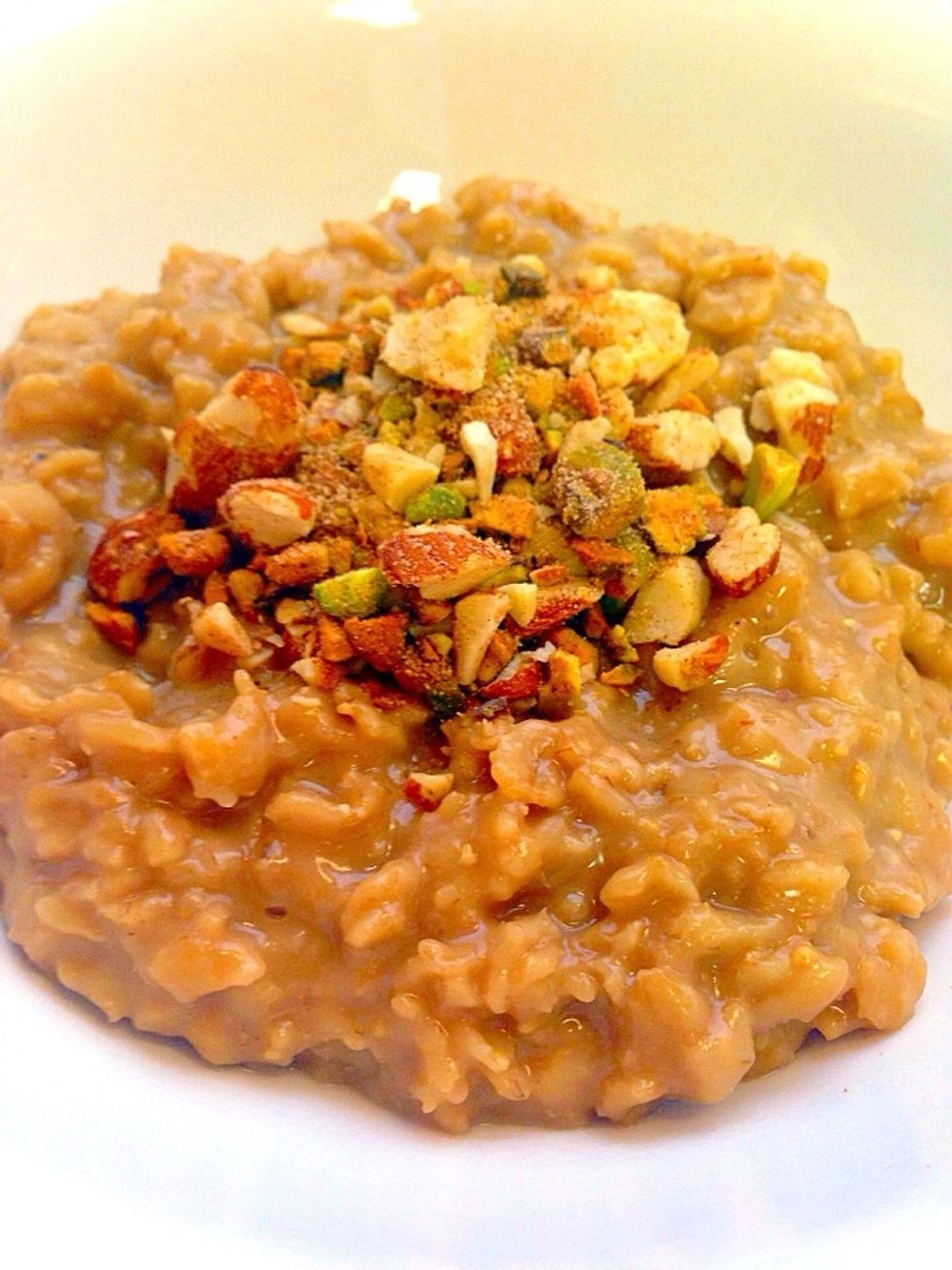 Place about one cup of oatmeal onto serving dish and top with cinnamon nuts ( I used pistachio and almonds, but you can mix your favorites)