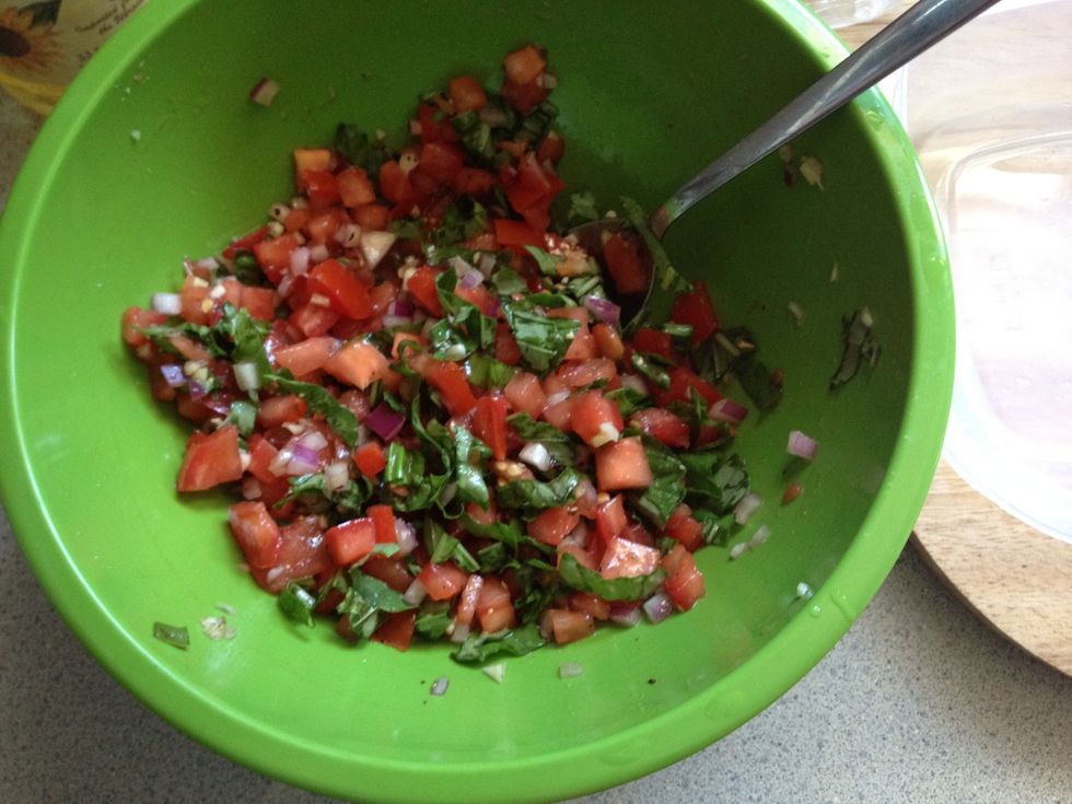 Cut your red onion into small squares. Depending on how much you are making, find a good ratio. Start small and try if you need more. But you don't want to over power it