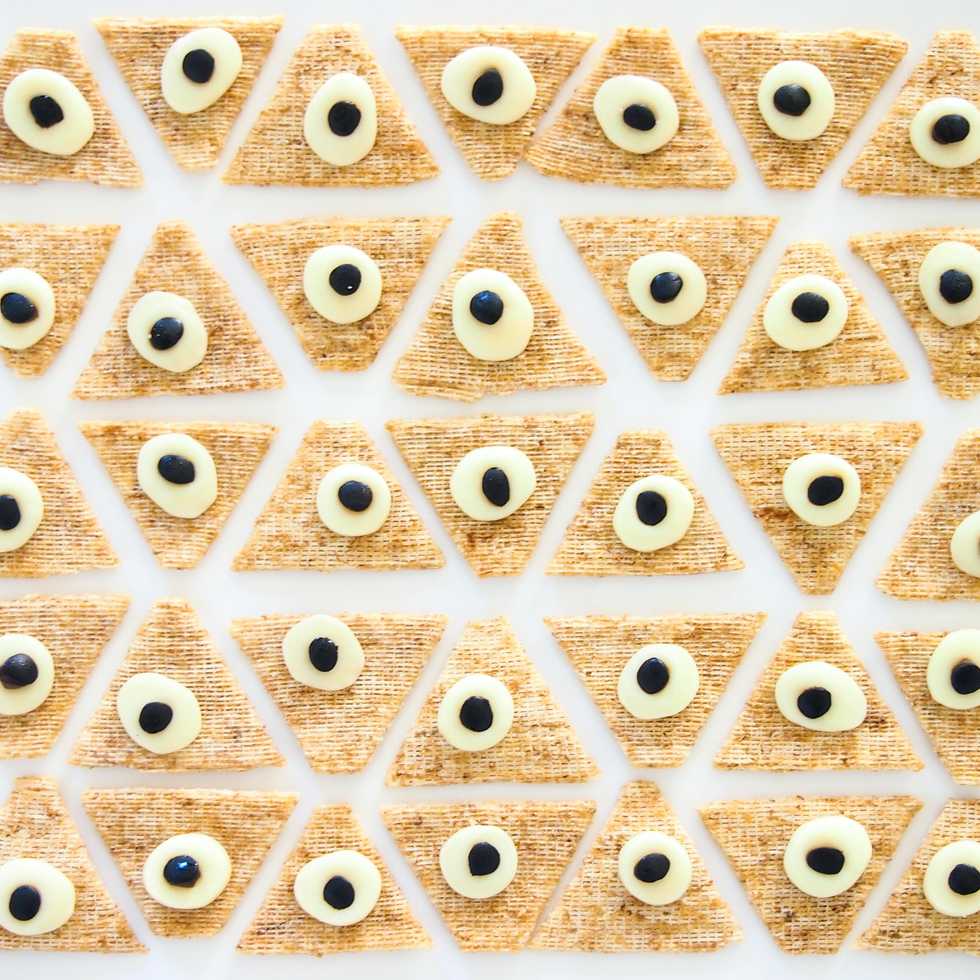 For most dishes, add the cheese disks at the end of cooking for the last few minutes. Remove from the oven and push in the olive pupils. Specific instructions for the Triscuits in the next step.