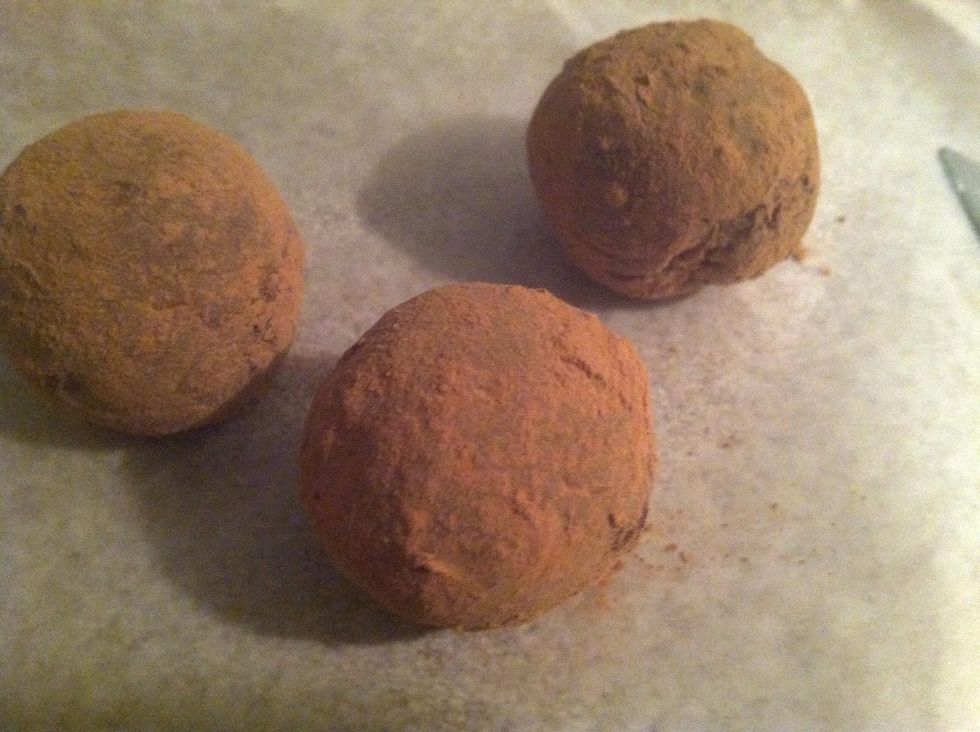 Roll in cocoa powder and fin. You can always melt almond bark and dip truffles into the chocolate. Just allow yourself time to let set up and harden. If in a pinch, dust with cocoa powder and be done.