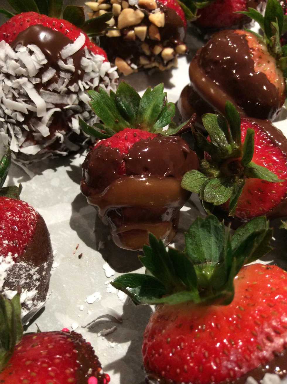 Once you finish creatively dipping your strawberries, simply put them in the refrigerator. With in an hour or so you should have delicious chocolate (and topping) covered strawberries.