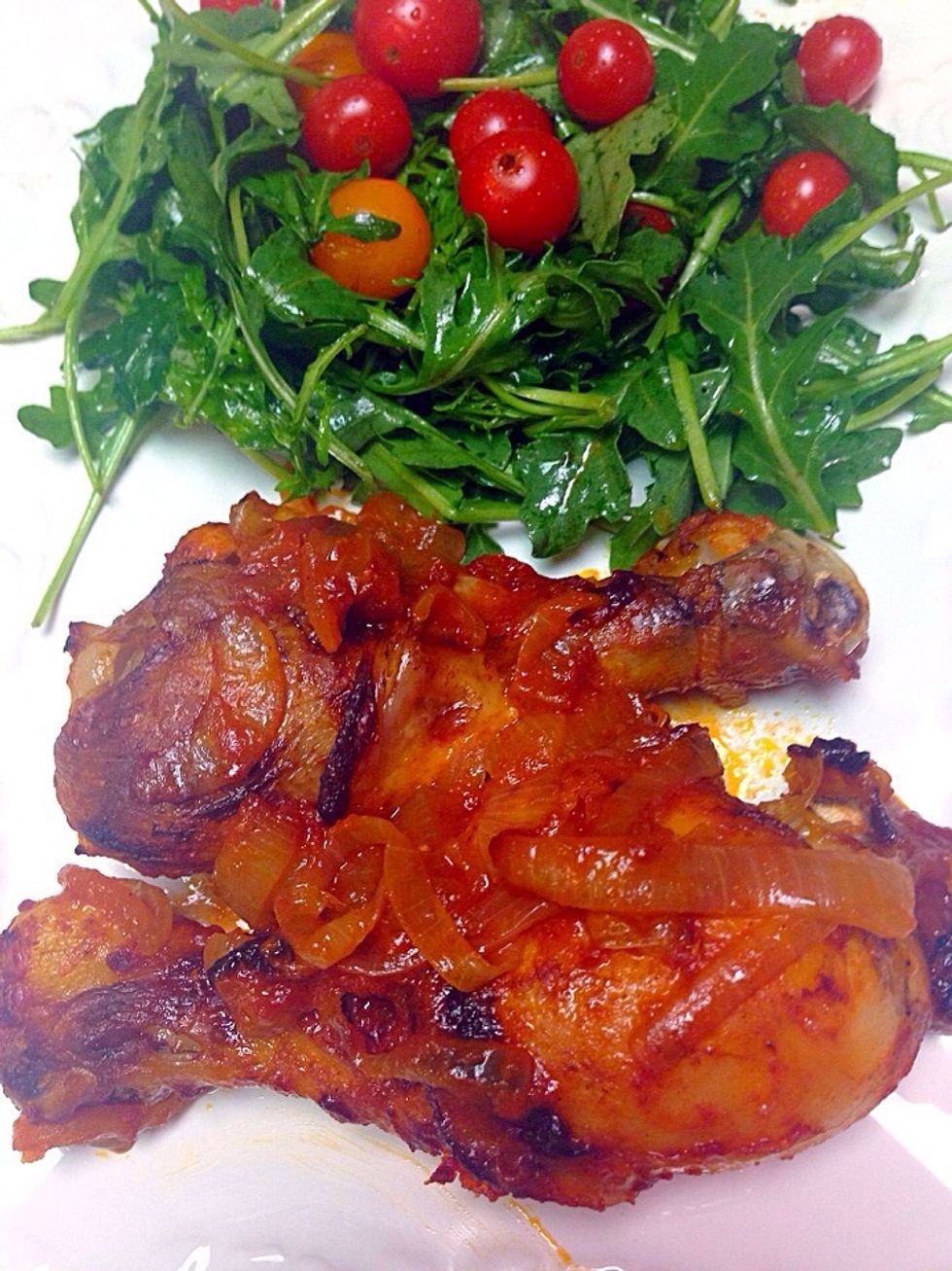 Rub chicken with 1/3 cup of tomato paste. Bake on 420 Fahrenheit for 1 1/2 hours turning the chicken over in the middle of baking
