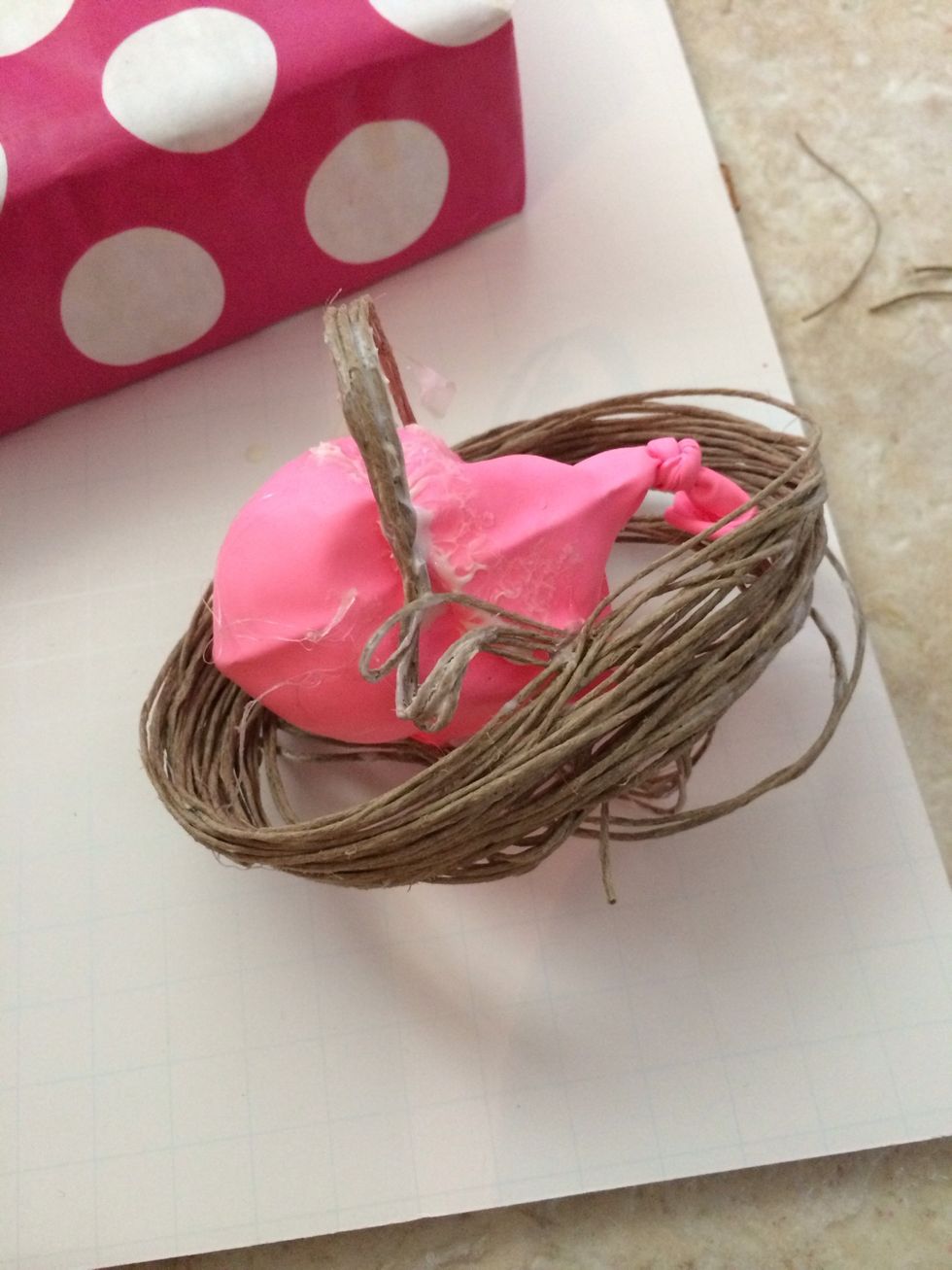 Ok, first, plug in the hot glue gun cut up 3-4 inch pieces of string. The more the merrier.