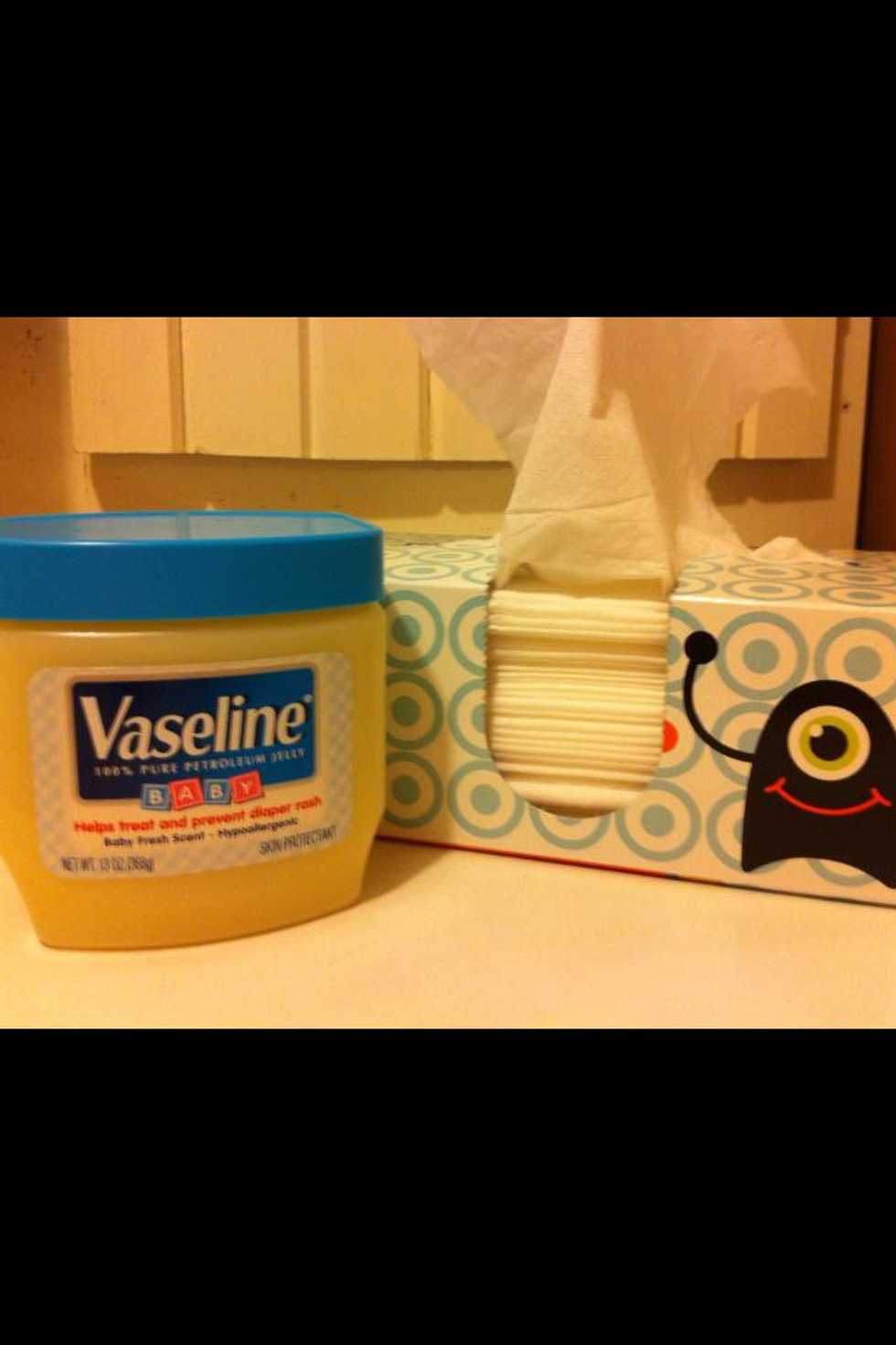 Rub finger over Vaseline (petroleum jelly). See on the finger is a very small amount.