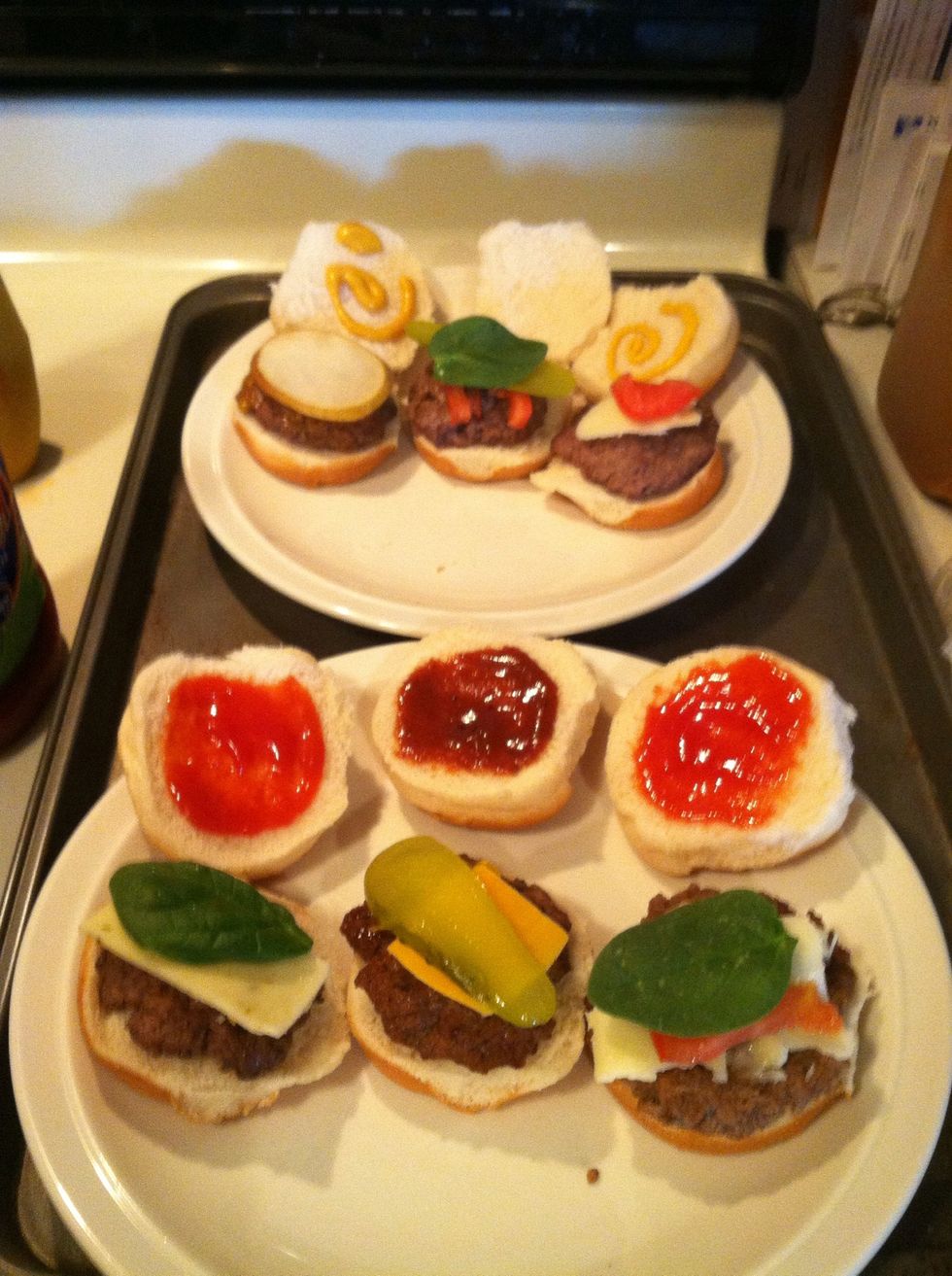These are different takes on the burger; perfect for GameDay! Work quickly--the burgers cool quickly, since they're small. Experiment with different recipes; these are never the same twice!