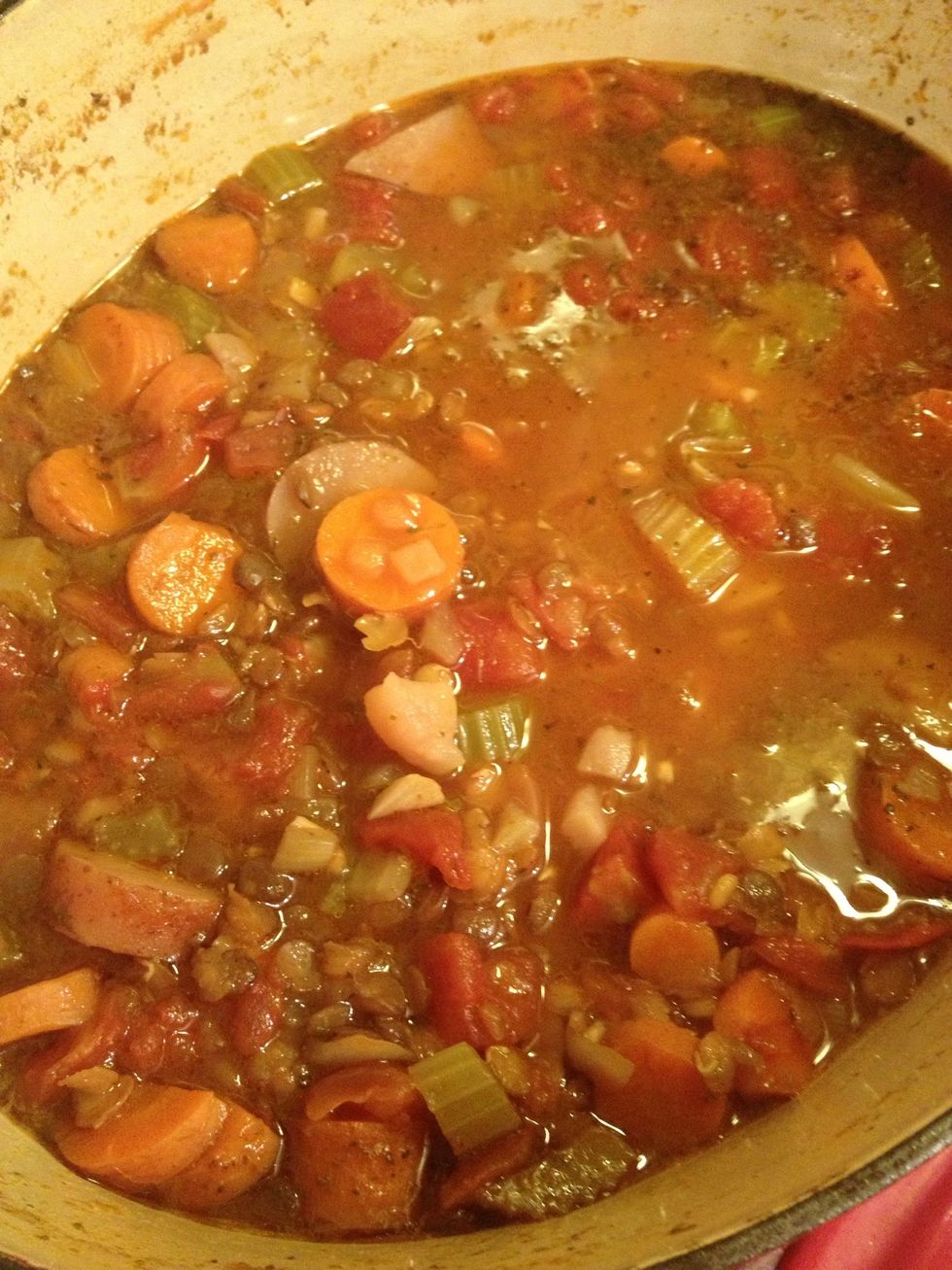 Now add the lentils, tomatoes(juice included), the entire box of chicken broth, and water. Stir. Now bring to a boil.