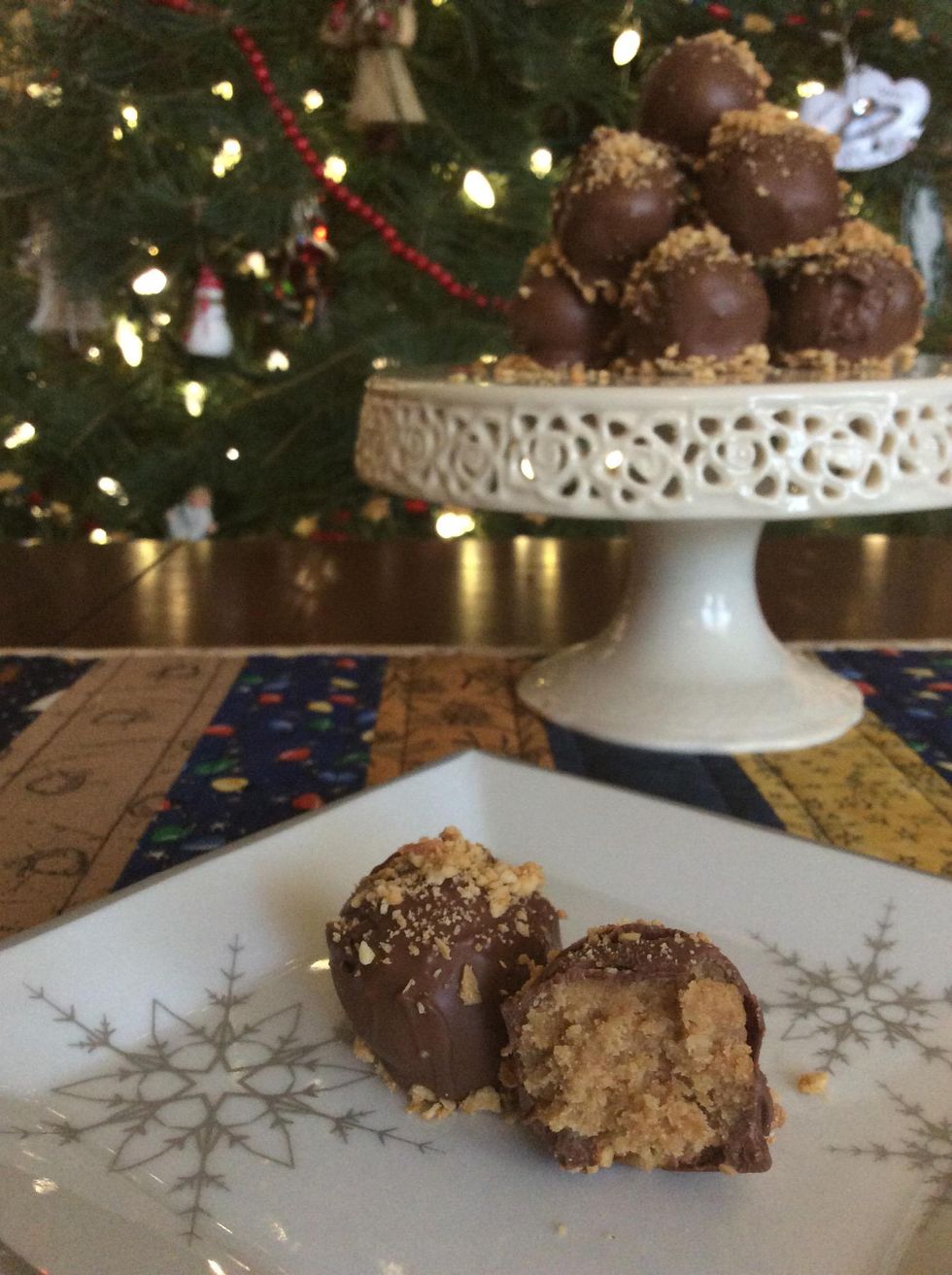 Place chocolate covered truffles on granulated peanuts and garnish with more chopped peanuts. Allow time for the chocolate to set.
