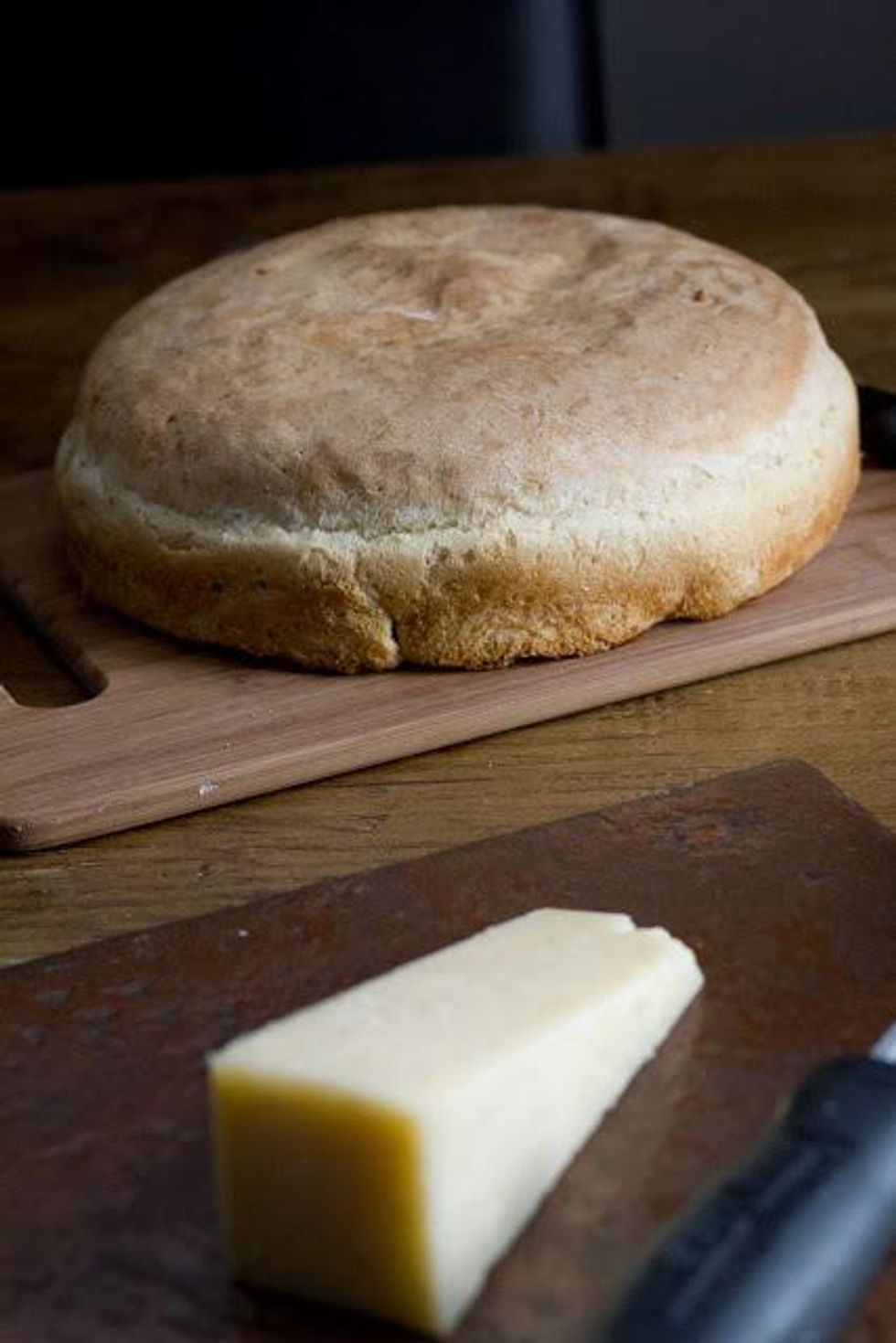 Put the bread on the middle rack in the oven and let it bake for about 40 minutes. When the bread turns brown on top and the top sounds hollow when tapped, it's done!