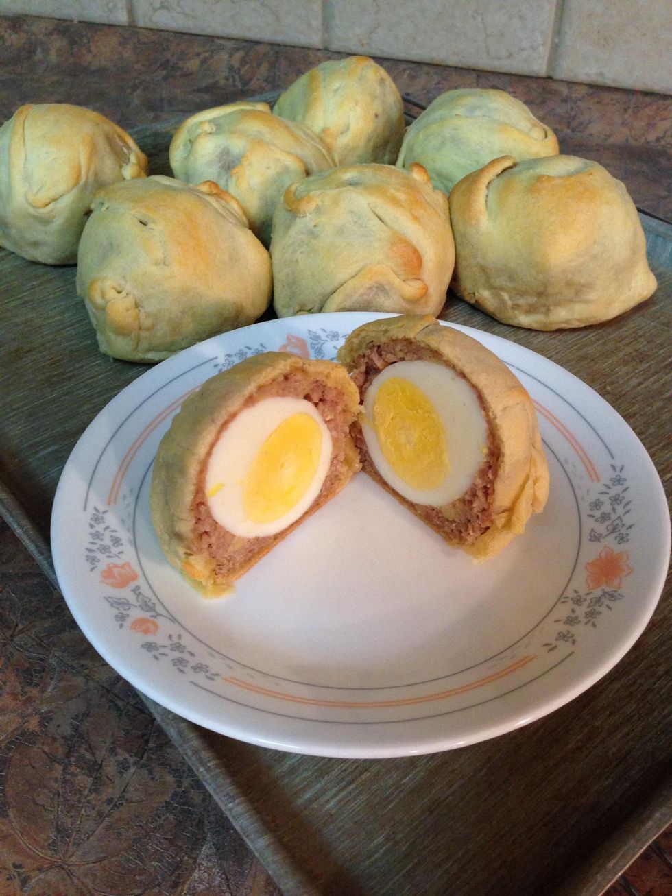 Dough bakes to a nice buttery tasty lightly crisp outside. Inside is savory browned pork and a hard boiled egg surprise inside!