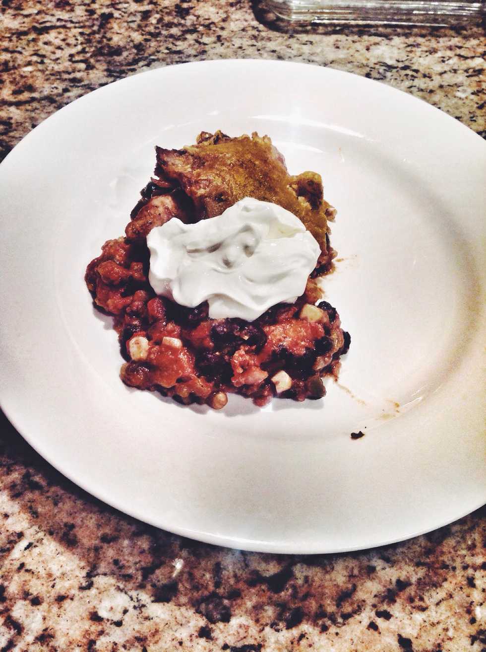 Line the bottom of your casserole dish with chunky crushed tortilla chips. I opted for wheat ones!