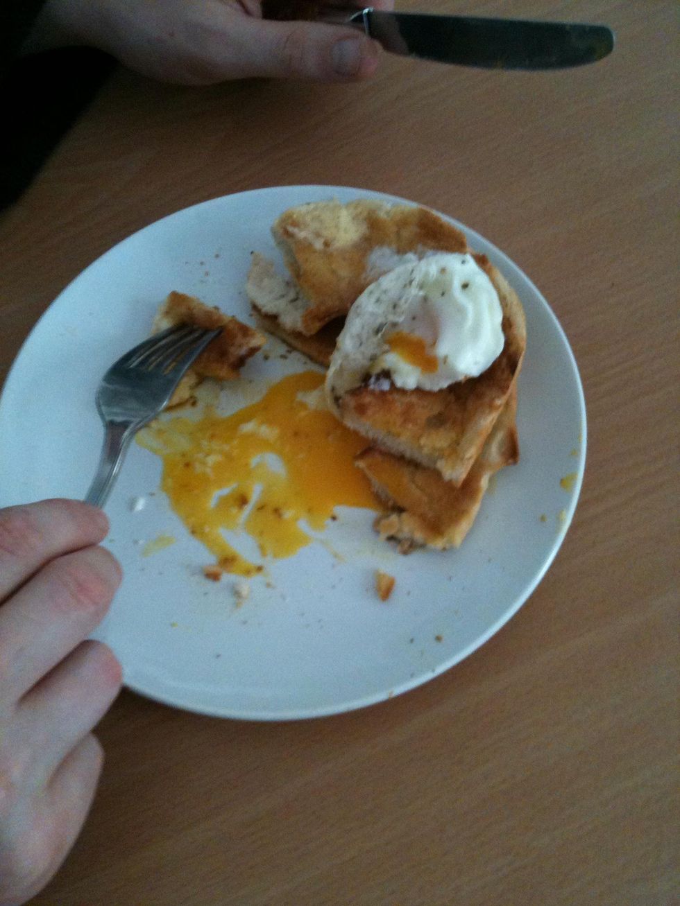 This is your poached egg! Gently lift him out of the water and set to cool for a few seconds, careful of the hot steam!
