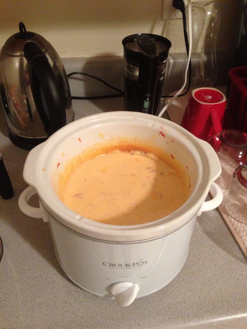 This is what it looks like complete. If you don't have a crock pot, you can put it in a pan or a microwave until it looks like this. Serve with chips or on top of any Mexican style dish.