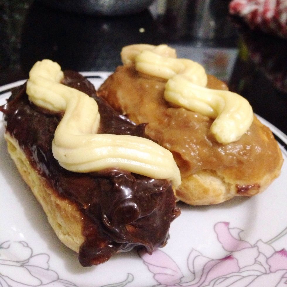 Final products! Left is chocolate cream with chocolate glaze eclair, and right is vanilla cream with butterscotch glaze. Yum!