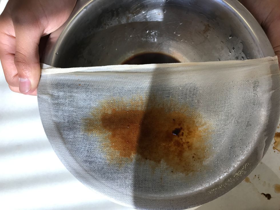 After letting the soup stock boil, get a bowl and place the same gauze over it. Pour the boiled soup stock over the gauze and let it drip down. This is the Miso Soup Stock.