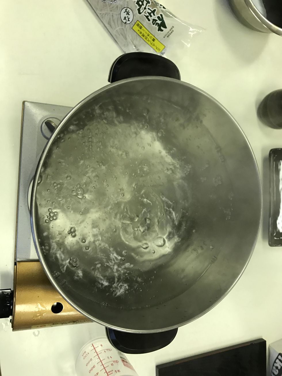 Transfer the soup stock into the cooking bowl. Set the gas burner at a constant temperature of 120 degrees celsius. Once boiling place the dried bonito into the soups stock.
