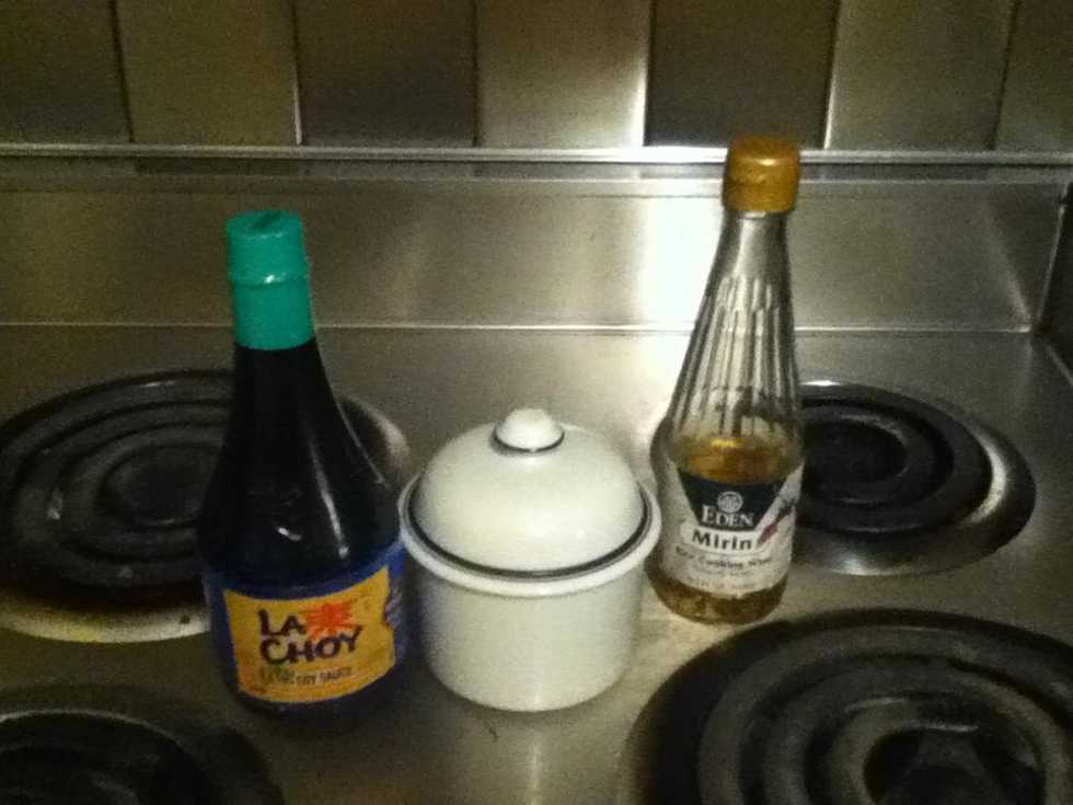 Here are the ingridents.Heat soy sauce, white sugar, and mirin in a small sauce pan over medium heat. Cook and stir until liquid is reduced to about 3/4s cup.Comment if you want any more guides. I'm board!