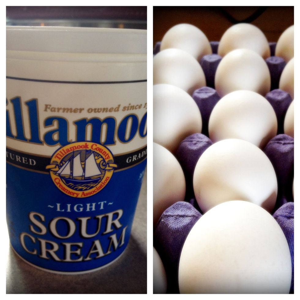 Crack the eggs and add a spoonful of sour cream. Whisk with a fork.