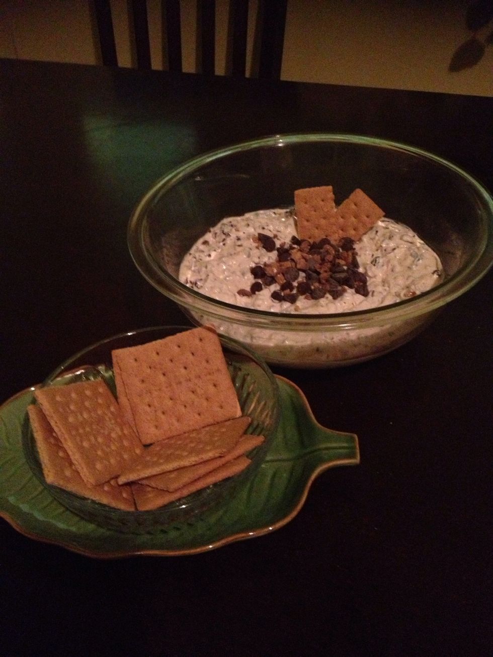 Add chocolate chips and toffee on top for garnish. I've also broken a graham cracker in half to stick in dip for visual appeal. Enjoy!