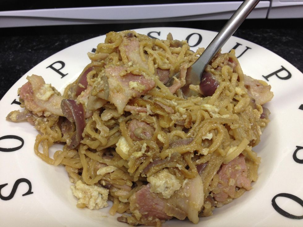 Once the bacon is cooked to how you want it (crispy, blackened etc) then drain the noodles and add to the wok