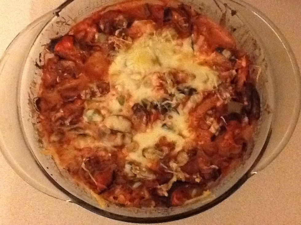 Spray the casserole dish. Mix the eggplant, green pepper, and mushroom in the dish. Add sauce and stir well.
