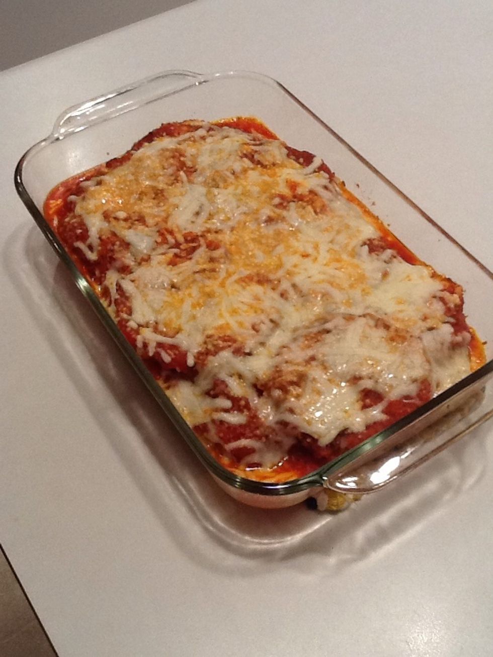Coat with rest of sauce and cheese.