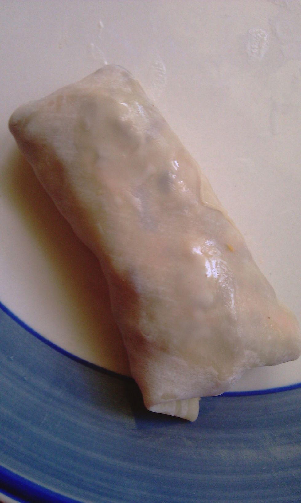 Place a big spoonful of the meat, cheese, and cabbage mixture on center of egg roll wrapper.