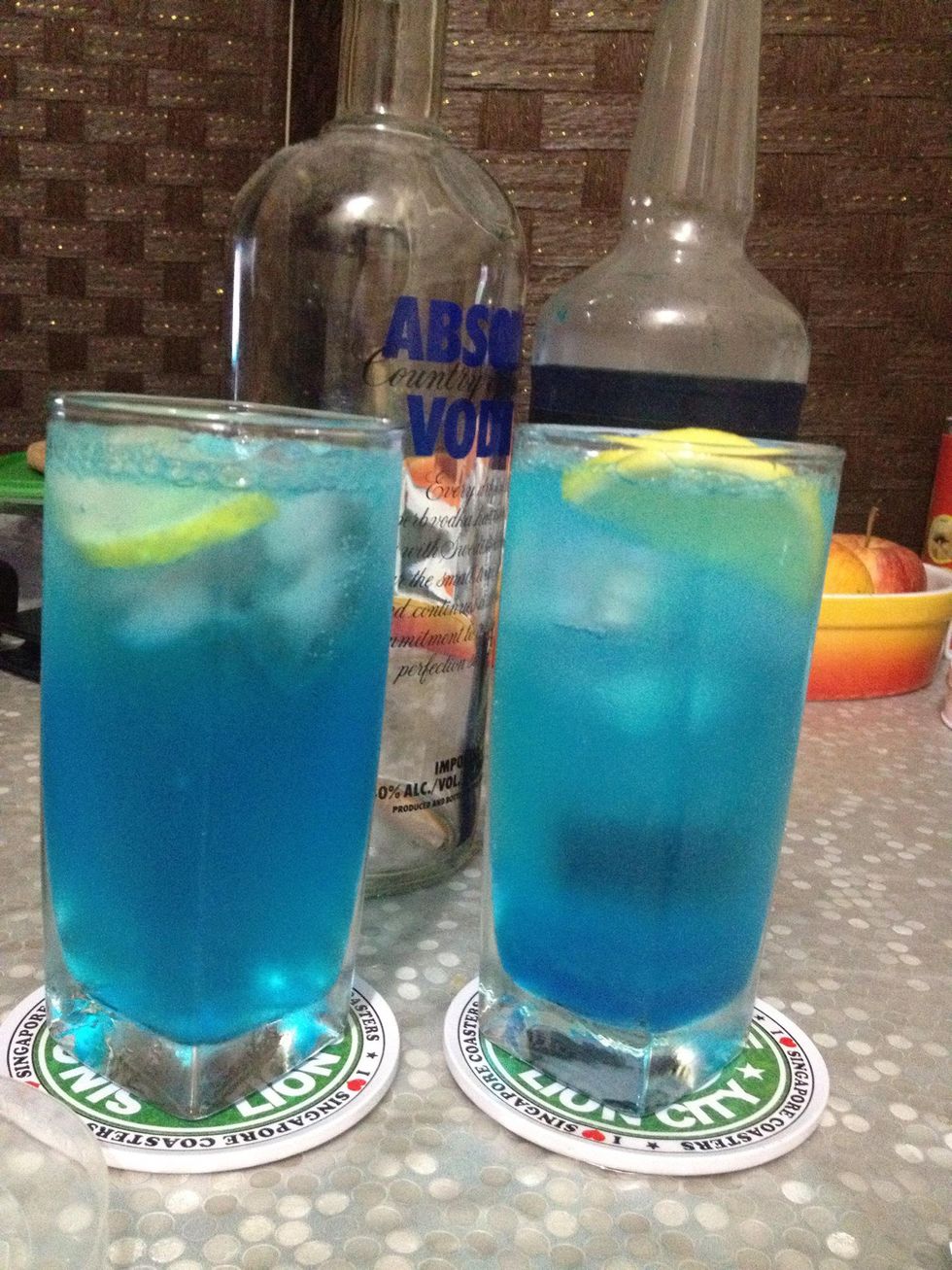 pour vodka over ice-filled glass. you might want to increase the quantity of vodka if you're using a non-alcoholic blue curaçao.