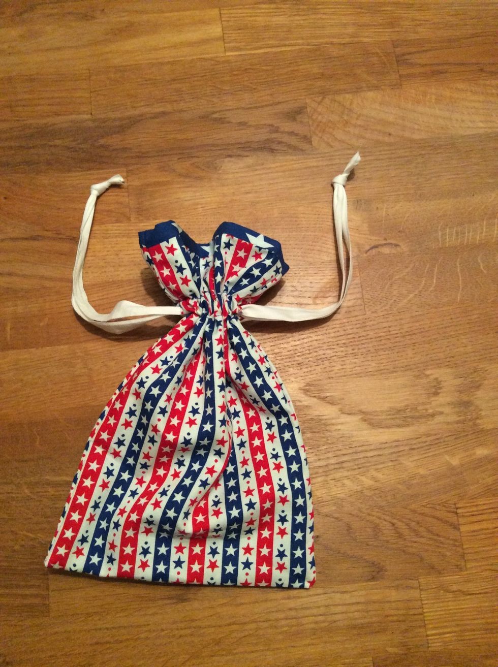 Klipp 2 band som är 50 cm långa. Sätt fast en av banden i en säkerhetsnål. Trä första bandet runt hela påsen och knyt en knut. Trä andra bandet på samma sätt fast från andra sidan.