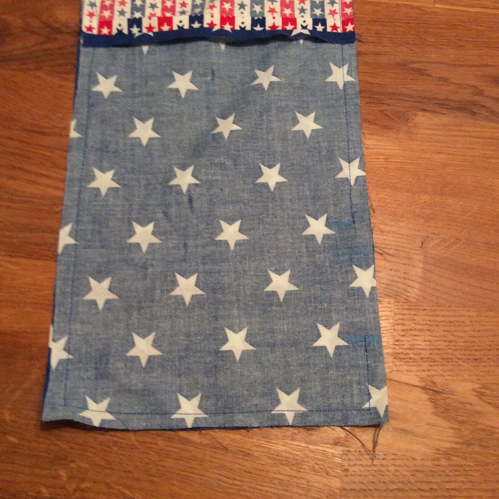 Sy en raksöm på en av kortsidorna 1 cm in från kanten (1 cm sömsmån) Glöm inte att fästa tråden genom att använda fix eller backen i början. och slutet av sömmen. Gör samma sak med de andra 2 tygerna.