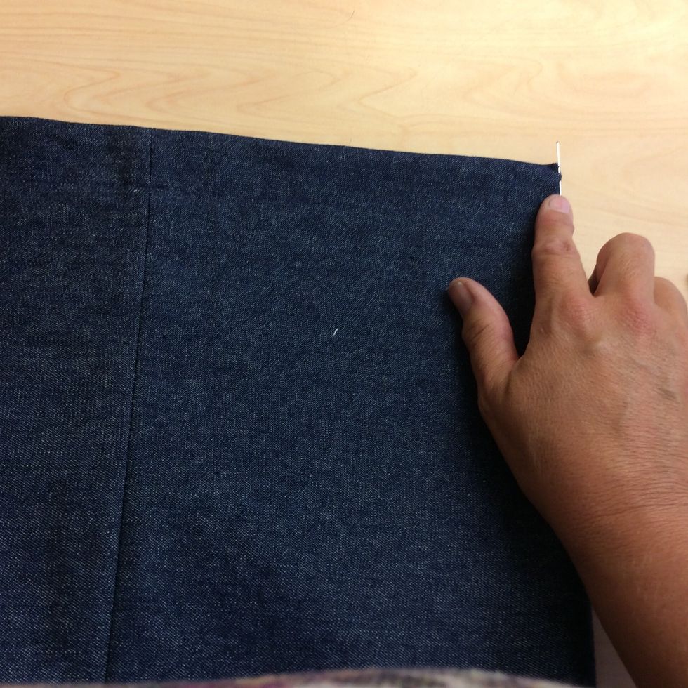 Nåla fast mallen på tyget, se till så att nålarna inte sticker utanför tyget för då klipper du i dem och saxen blir då förstörd. Se även till att spara på tyget så mycket du kan.