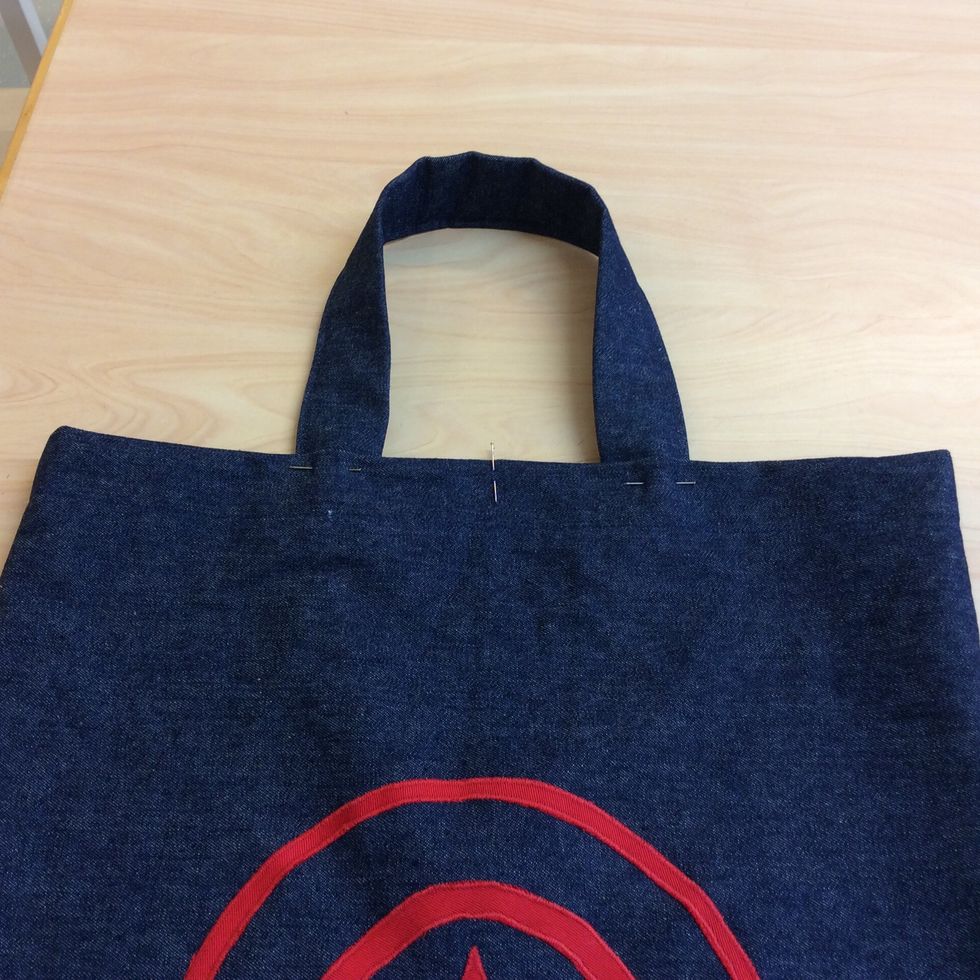 Vik nu handtagen en sista gång och nu ska inga klippta tygkanter synas på långsidorna.
