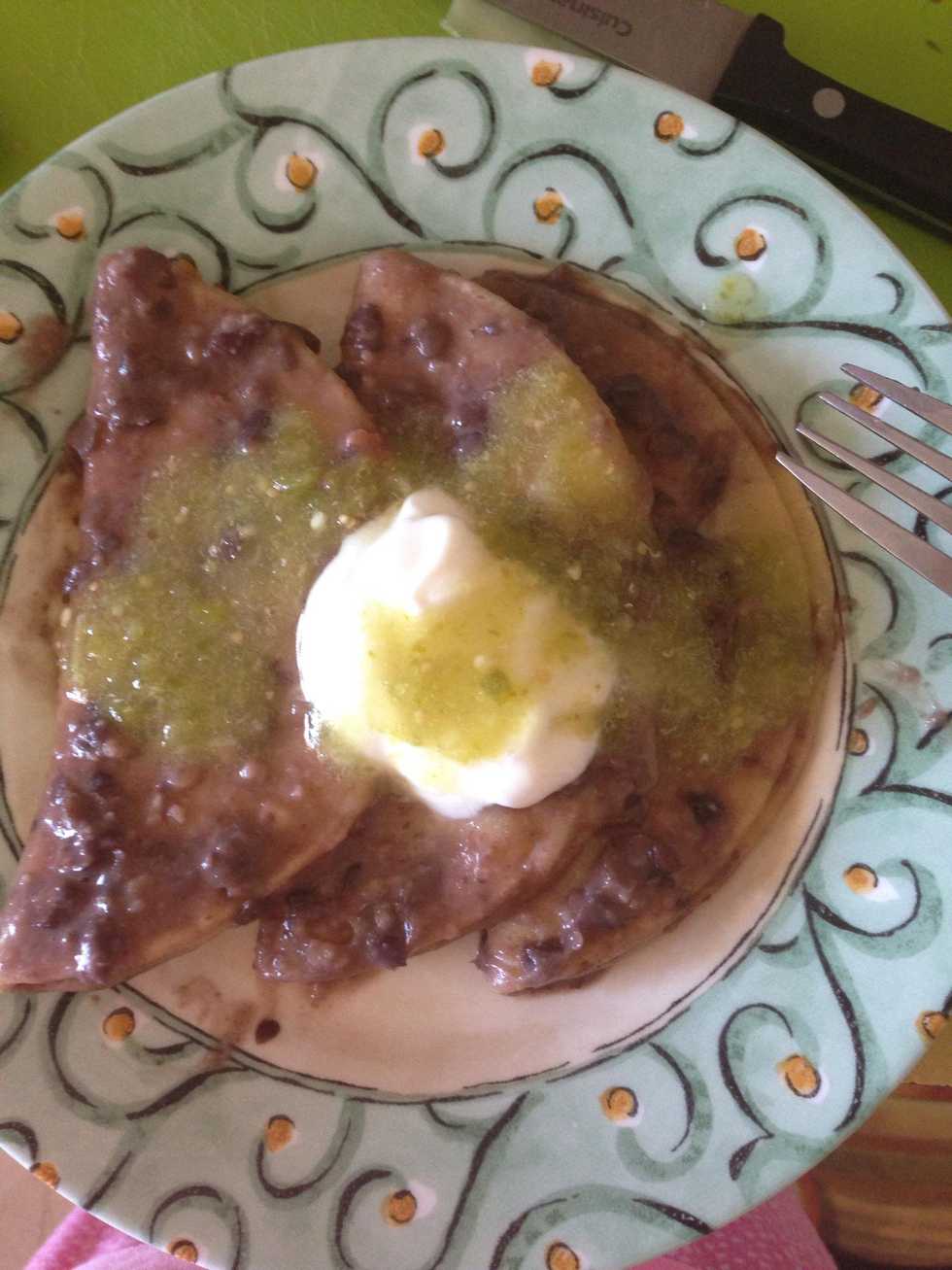 Take your quesadillas and dip them in the beans. Top with sour cream and salsa. Quick and amazing!
