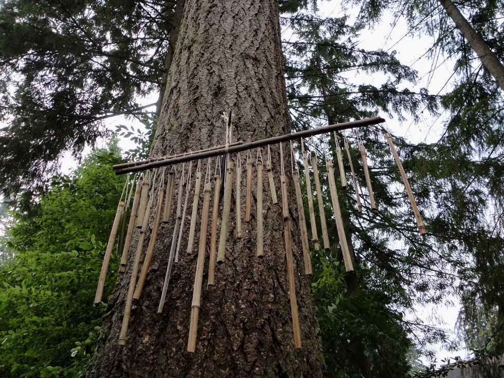 Next use your twine, fishing line etc and tie the bamboo pieces to the top bar. Vary the widths and lengths as you go as I think it makes the sounds nicer.
