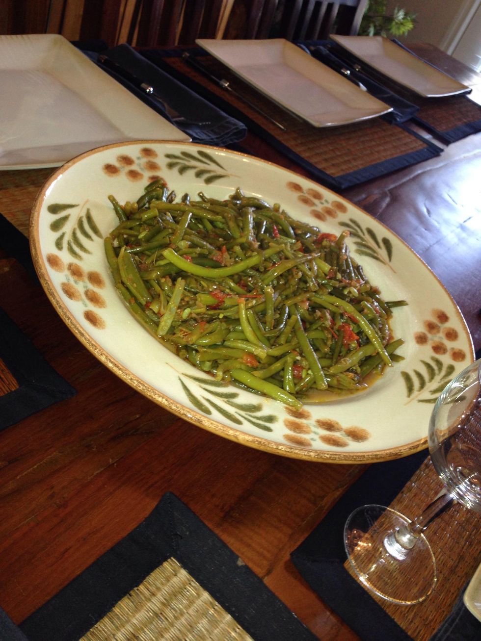 Add the green beans and continue to stir for a couple more minutes to coat with onions and garlic.