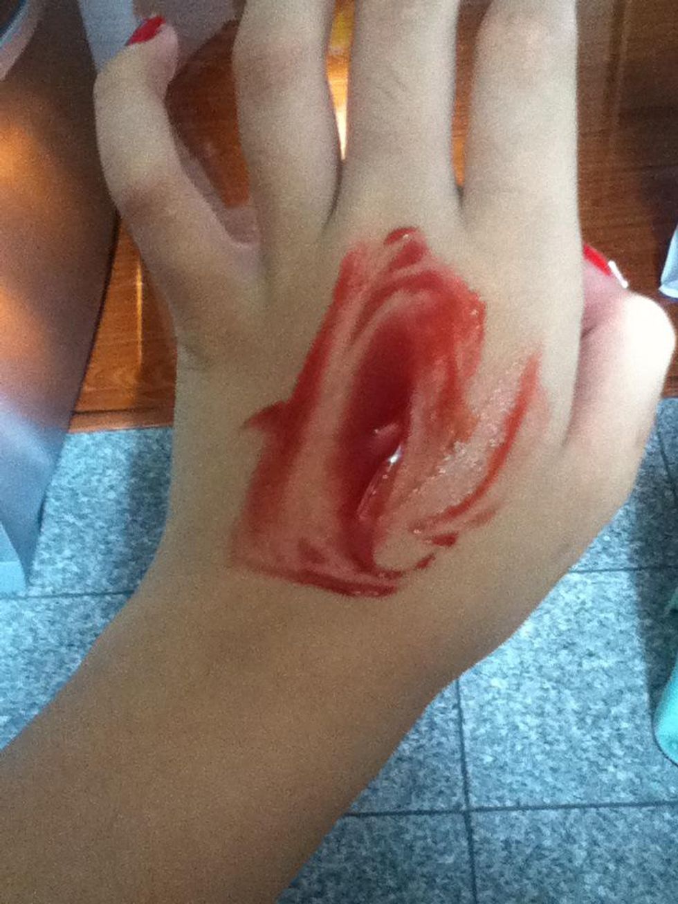 Best application (In my opinion): drop a dot of the fake blood onto your skin, then use your mixing stick to draw circles in the blood. Blood is messy! Don't be afraid to go crazy with your blood!