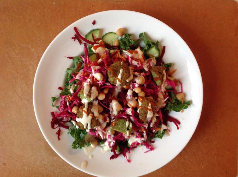 Add chickpeas and falafels. Drizzle with tahini dressing and hot sauce. Sriracha is popular, but I used Valentina sauce from Mexico. Enjoy!