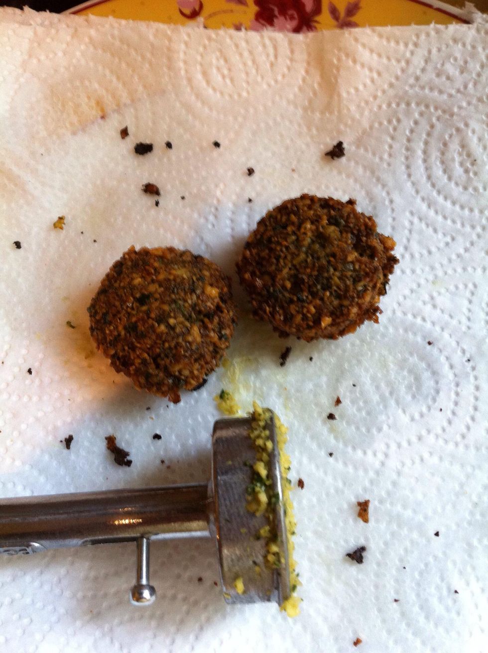 After heating the oil up to 180C you can start frying the Falafels. You can use 2 spoons to make the round shape. Fry it until its nicely brown and crispy.