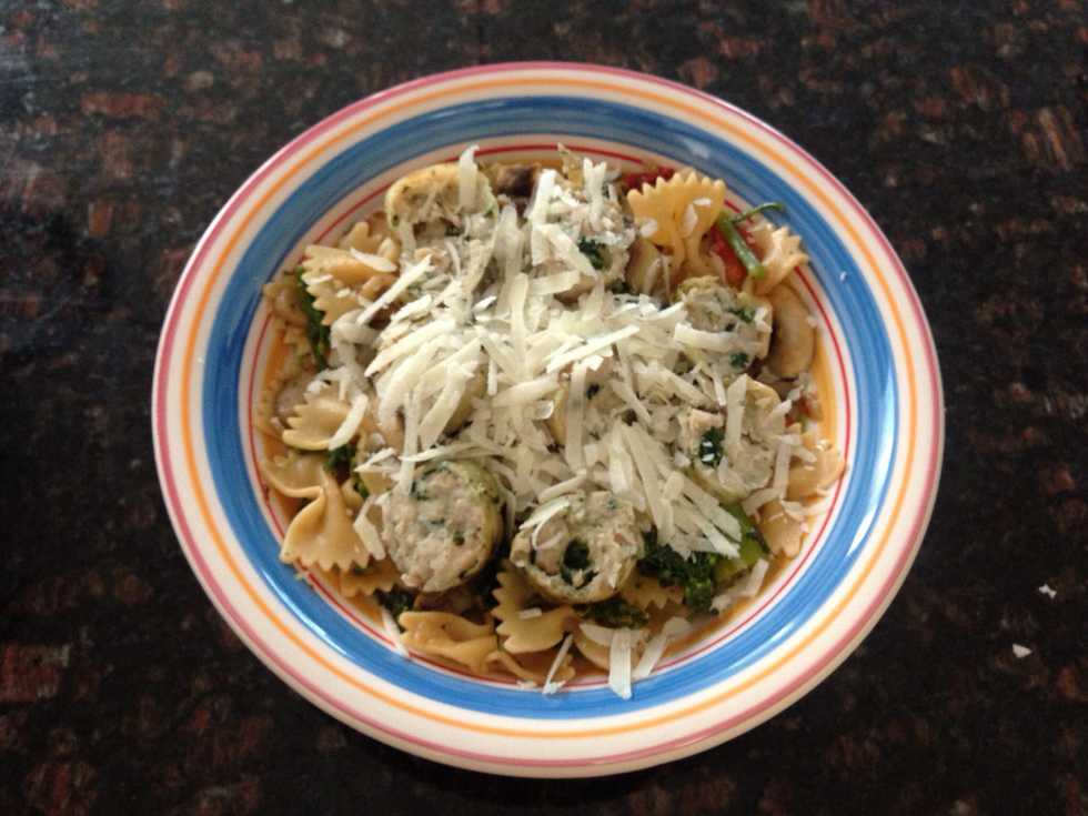 Add the sliced sausage to the pasta and serve into pasta bowls. The finishing touches, grate some fresh Romano Locatelli Cheese on top. This gives it the perfect "bite" to the dish.