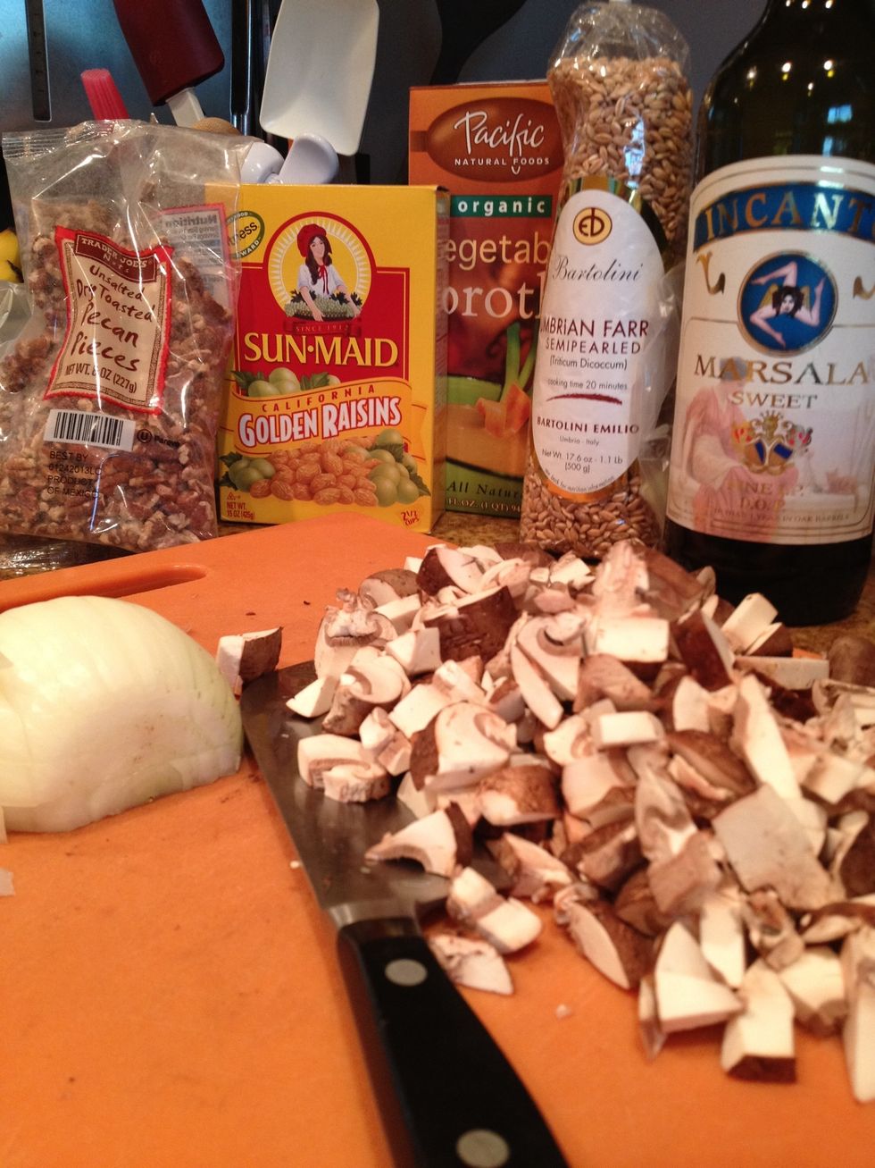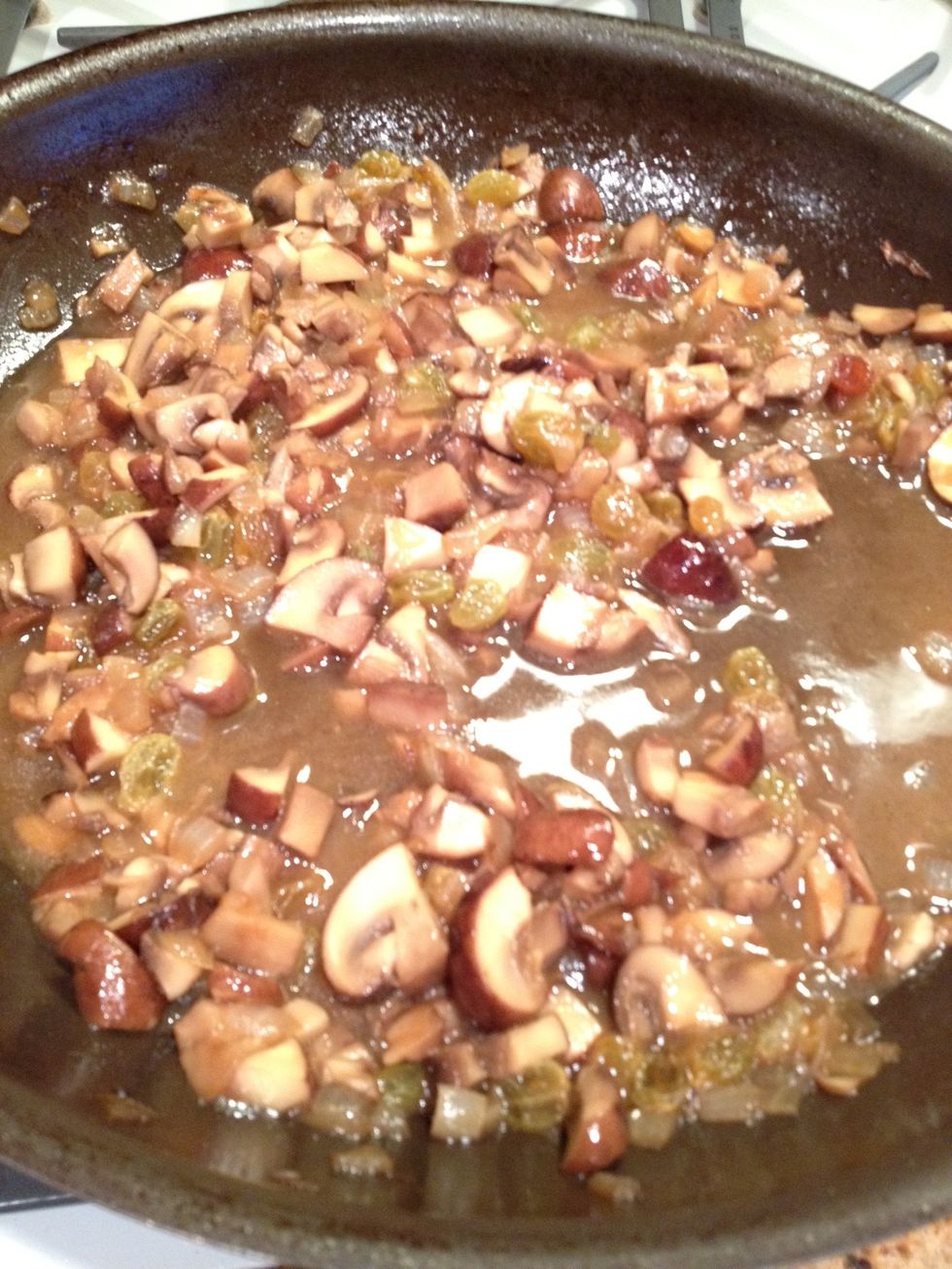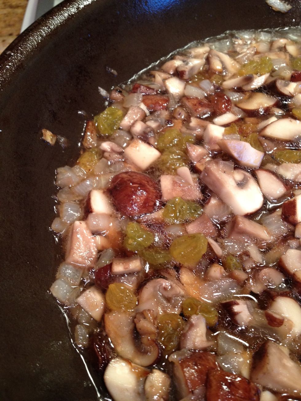 When the mushrooms and onions have sautéed mushrooms are brown add the raisins and the marsala