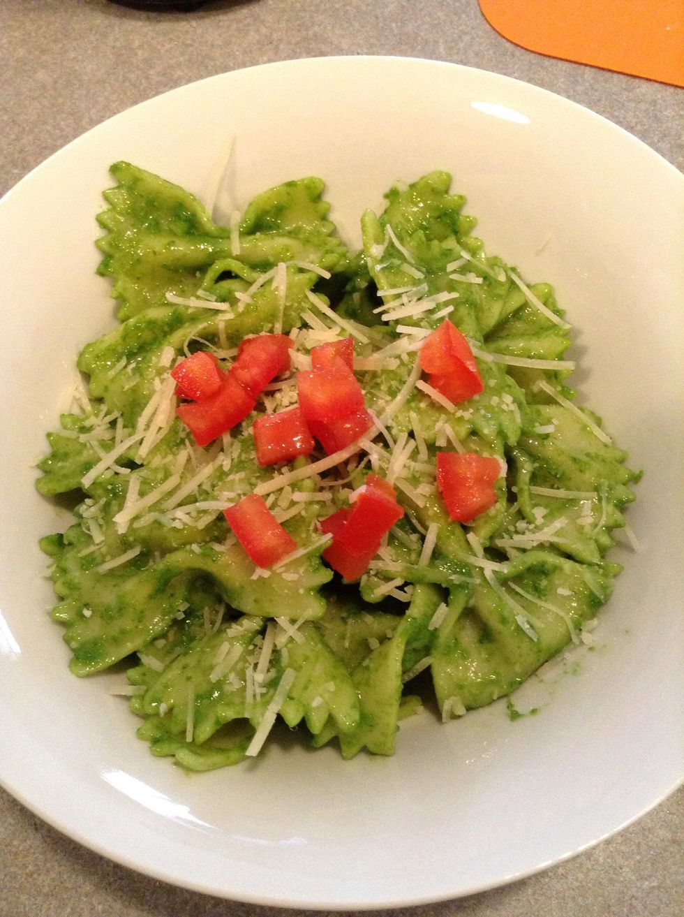 I mixed it over pasta and added some Parmesan cheese, tomatoes, and red pepper. Serve hot or cold! Enjoy!