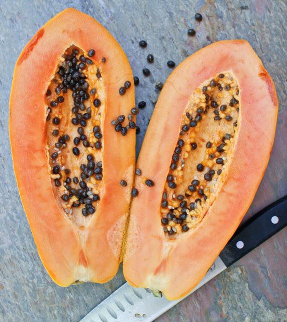 Wash the papaya then peel it and scoop out the seeds. Chop the papaya into small pieces. Toss in the chopped nuts and mix them in well.