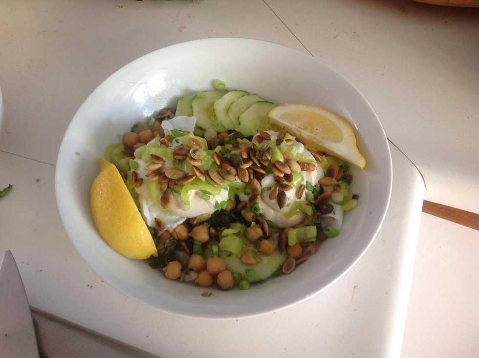 Add the youghourt/tahineh, poached egg, peppers, green onion and pepitos. Garnish with a lemon wedge. Eat it Peggy, eat it, eat it!