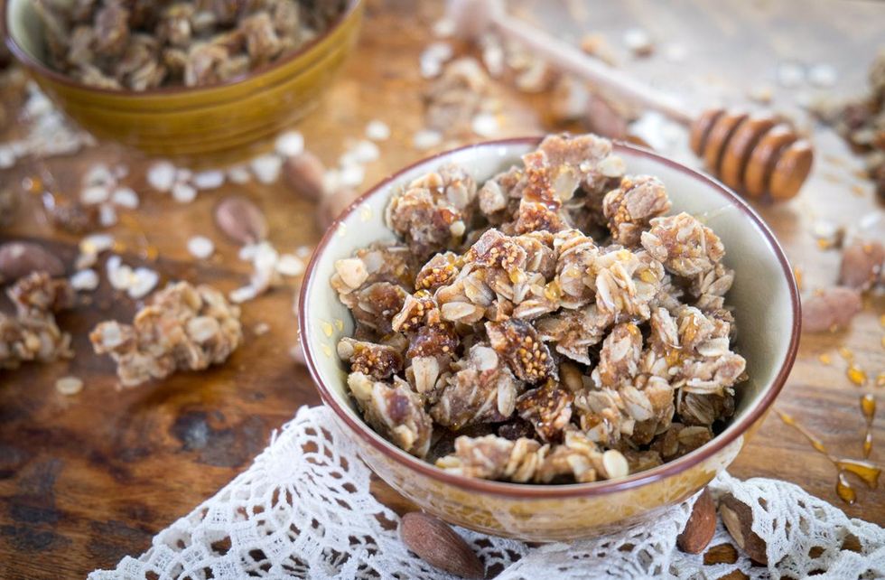 Spread unbaked granola on a baking sheet lined with parchment. Bake in 250 degree oven for 60 minutes. Break up any overly large chunks, leaving some clusters. Mix in dried figs. Let cool.