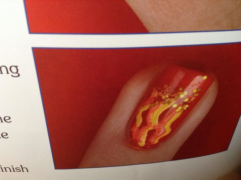 First, paint them in a red color. Let them drySecondly, grab a toothpick and cut one end of it ( it may need muscles )After, add some orange lines ( I do not have orange )Then, add yellow linesLastly, add the glitter