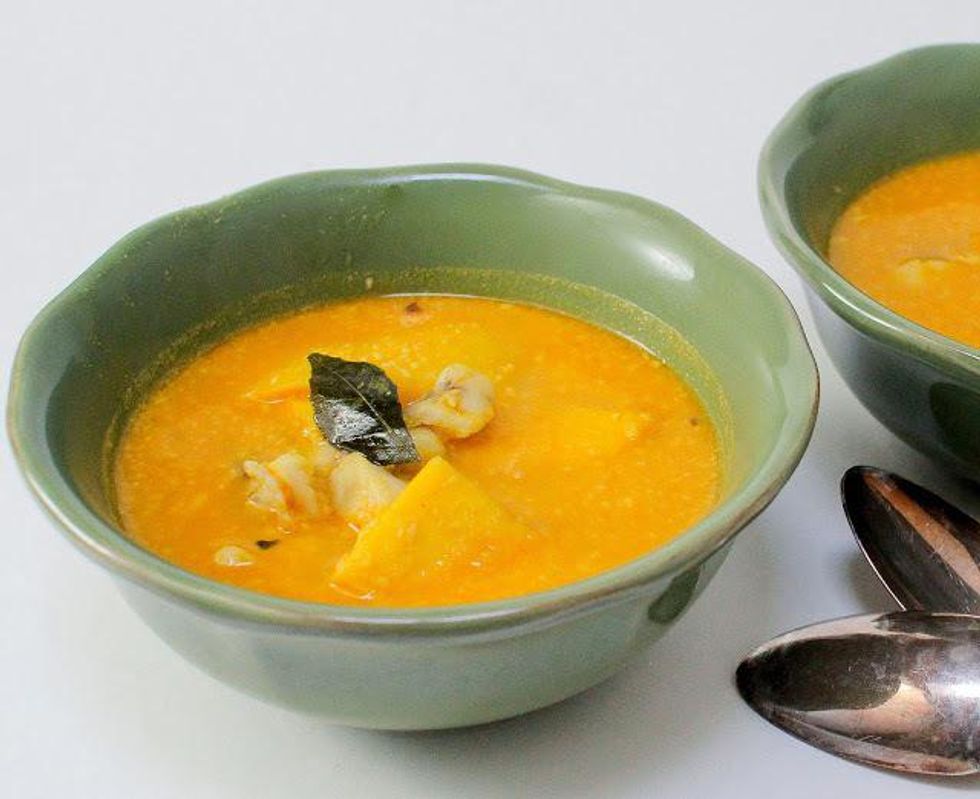 Grind the coconut, Kashmiri chili, serrano chili, garlic or shallots, turmeric, ginger, and water together in a blender or food processor until you have a smooth paste.