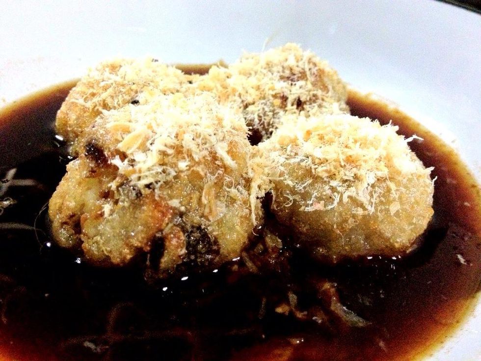 Fry te fishballs in about 3 minutes or until no more pops come out. And there you go ... your fishballs or pempek is ready! Now, serving time