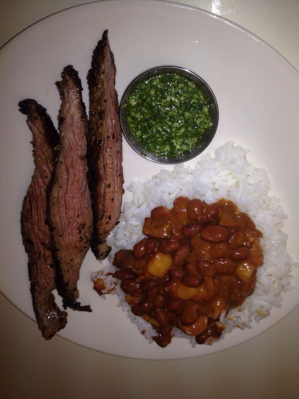 Spoon 1/3 of your chimichurri mixture onto one side of your flank steak and let sit.